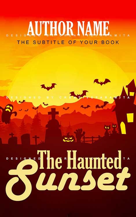 Halloween book cover, spooky fantasy design, haunted sunset art, ghost story illustration, paranormal adventure cover, supernatural comedy book, bat and graveyard silhouette art.